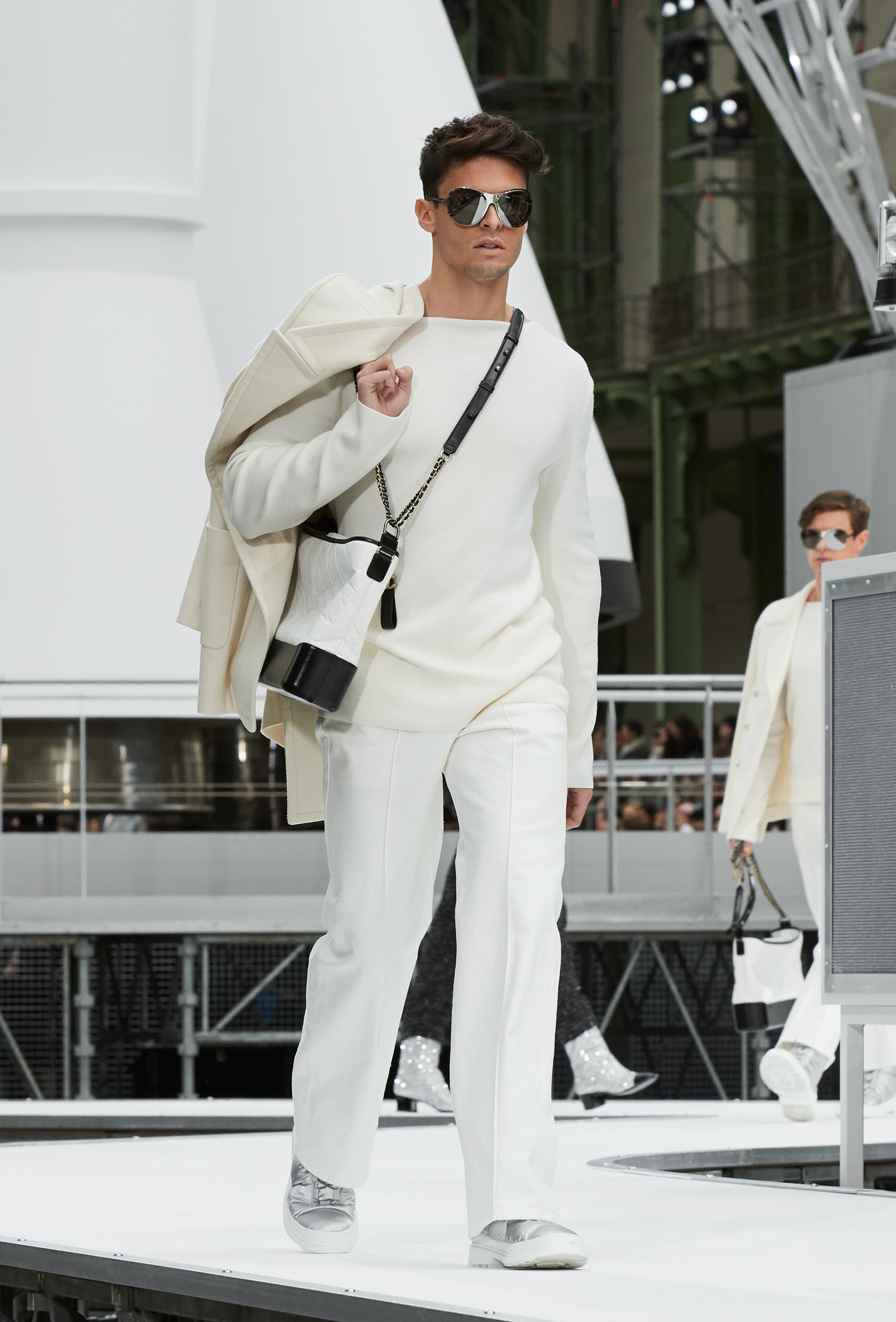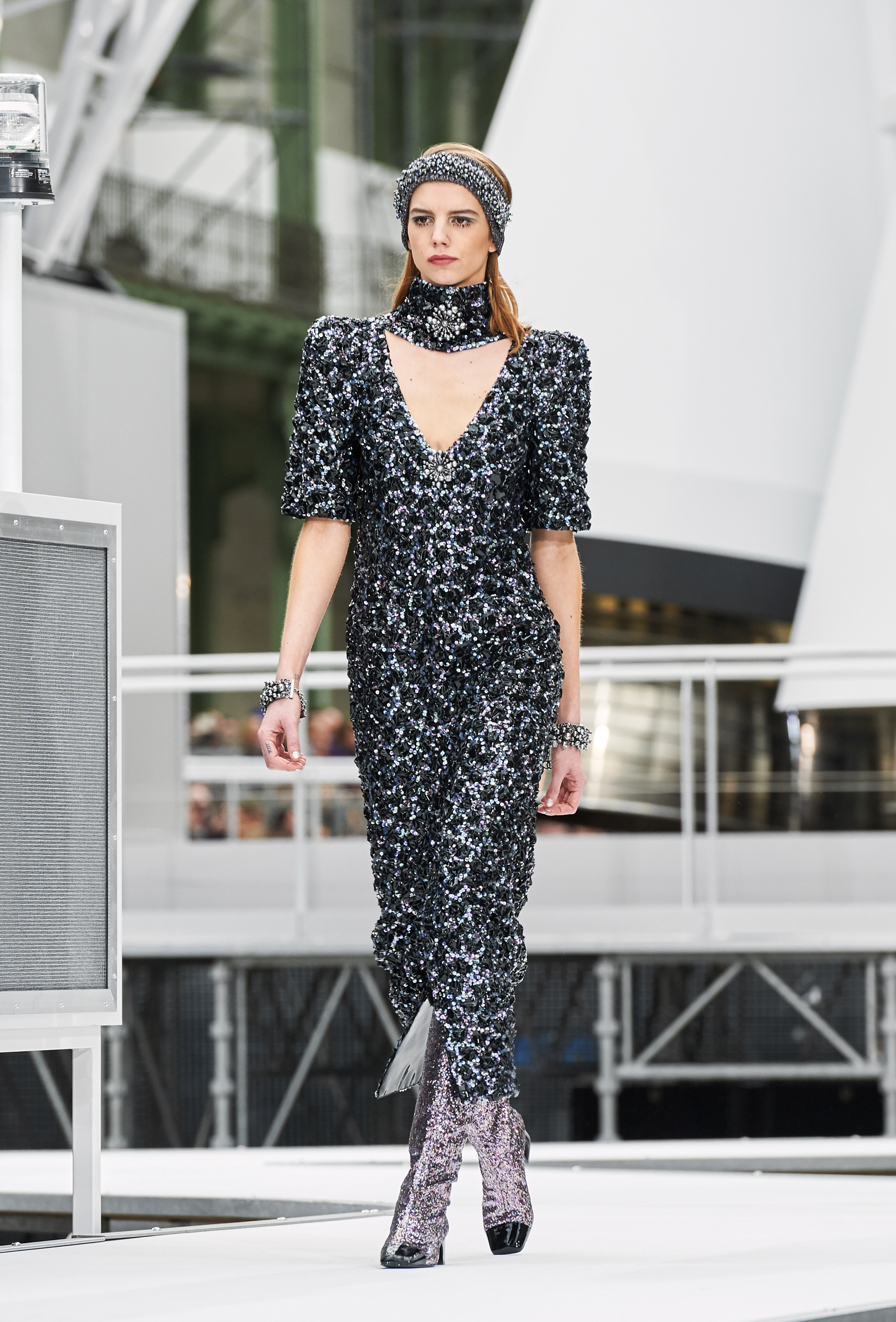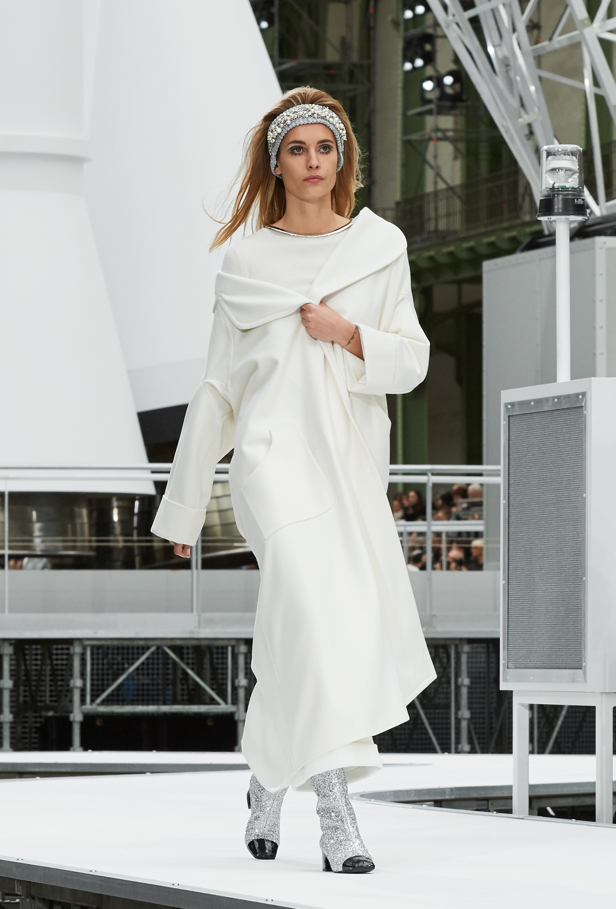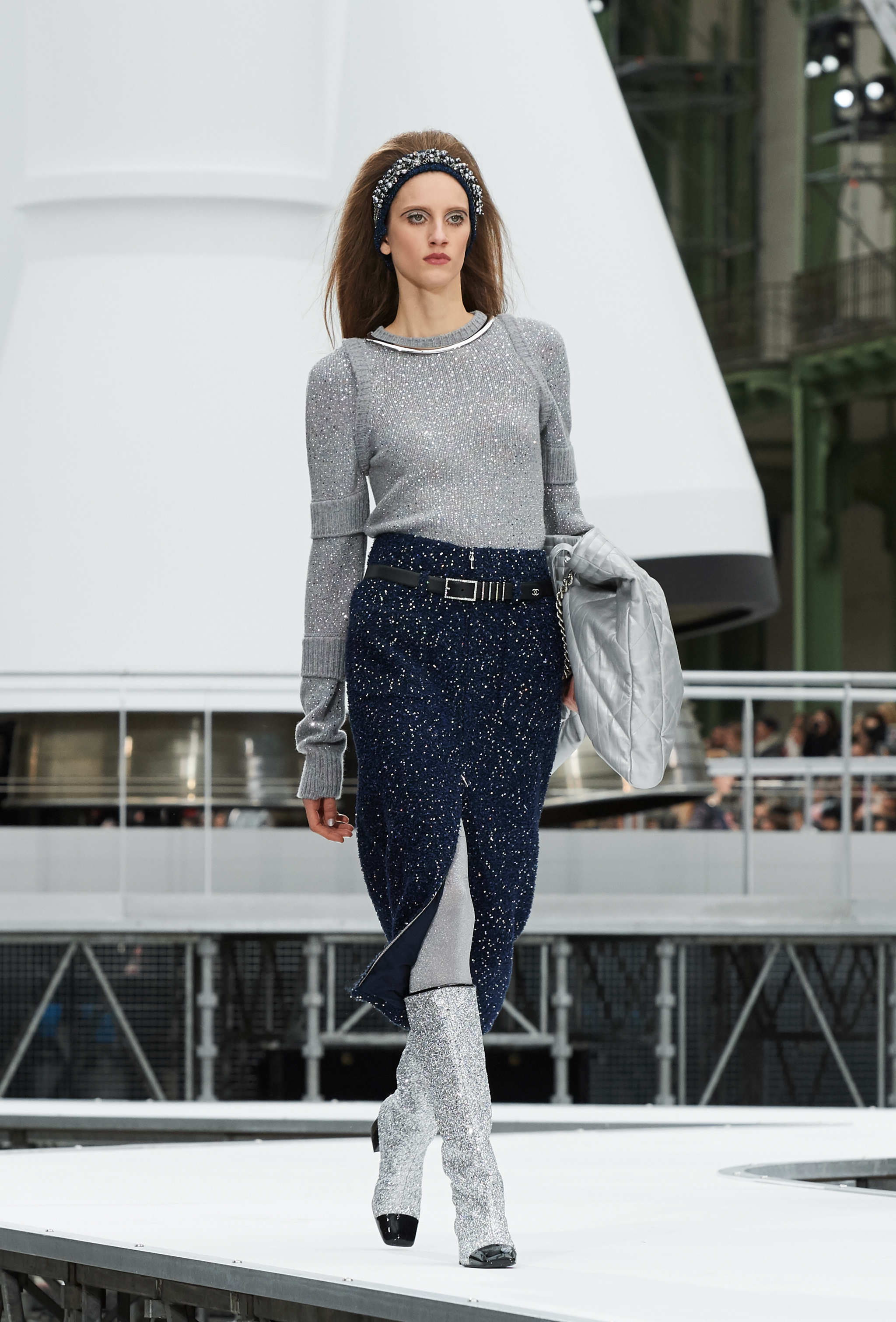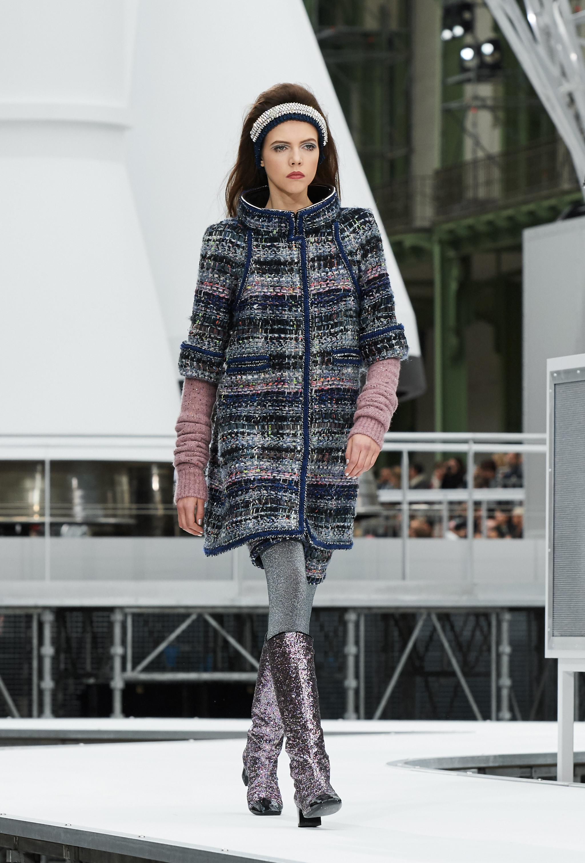 Um desfile que decolou para o espaço sideral teve uma pegada dos anos 60 e transformou o Grand Palais em uma base espacial com direito a um foguete em tamanho real, com 35 metros de altura, estilizado com logotipo da marca e instalado no centro da locação (e que se distanciando 10 metros do solo em direção ao teto de vidro do local).