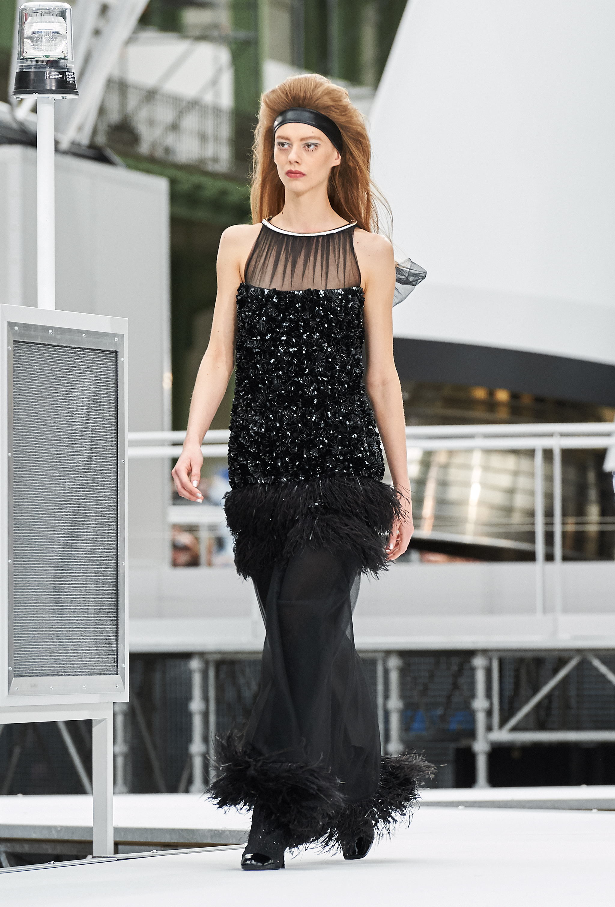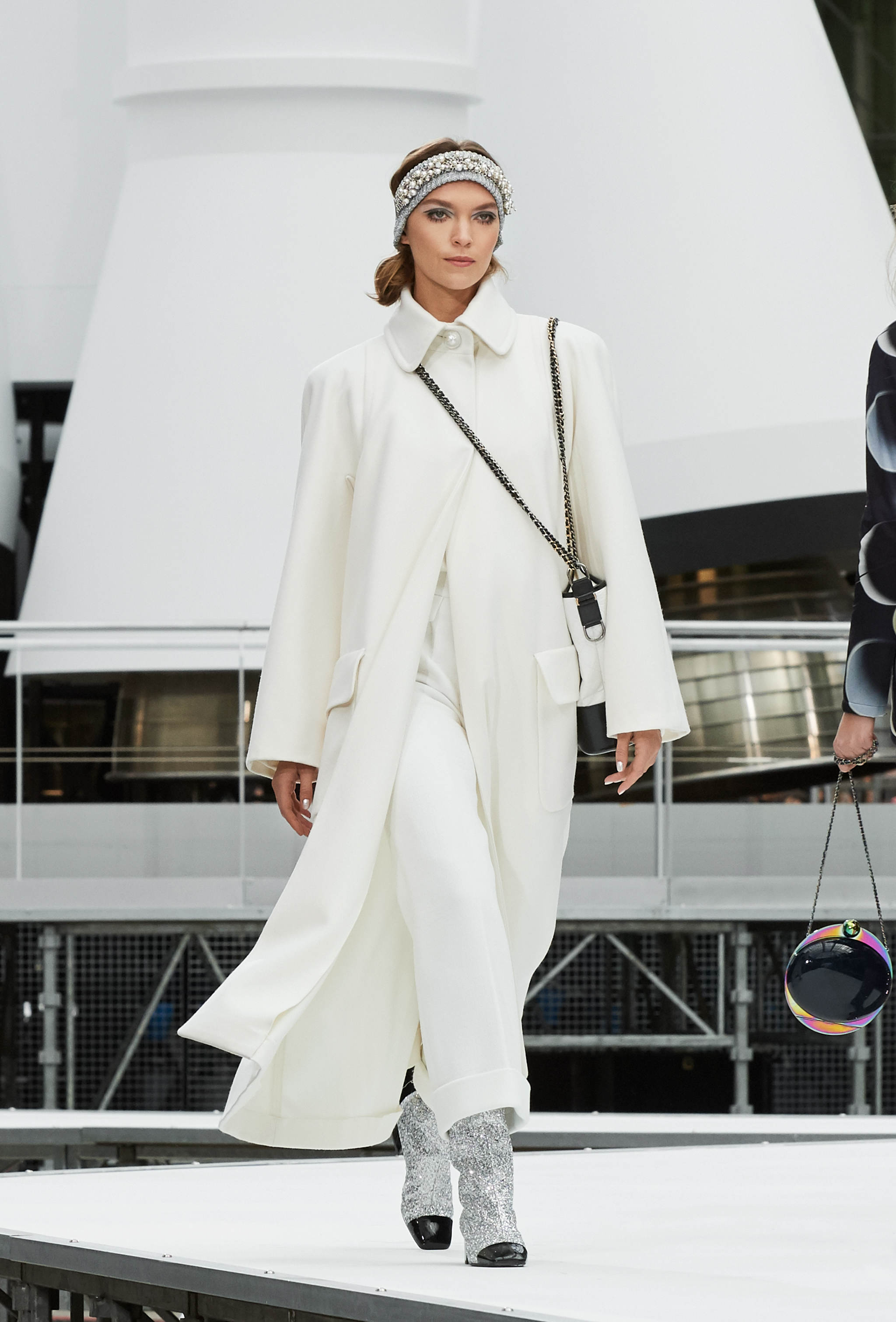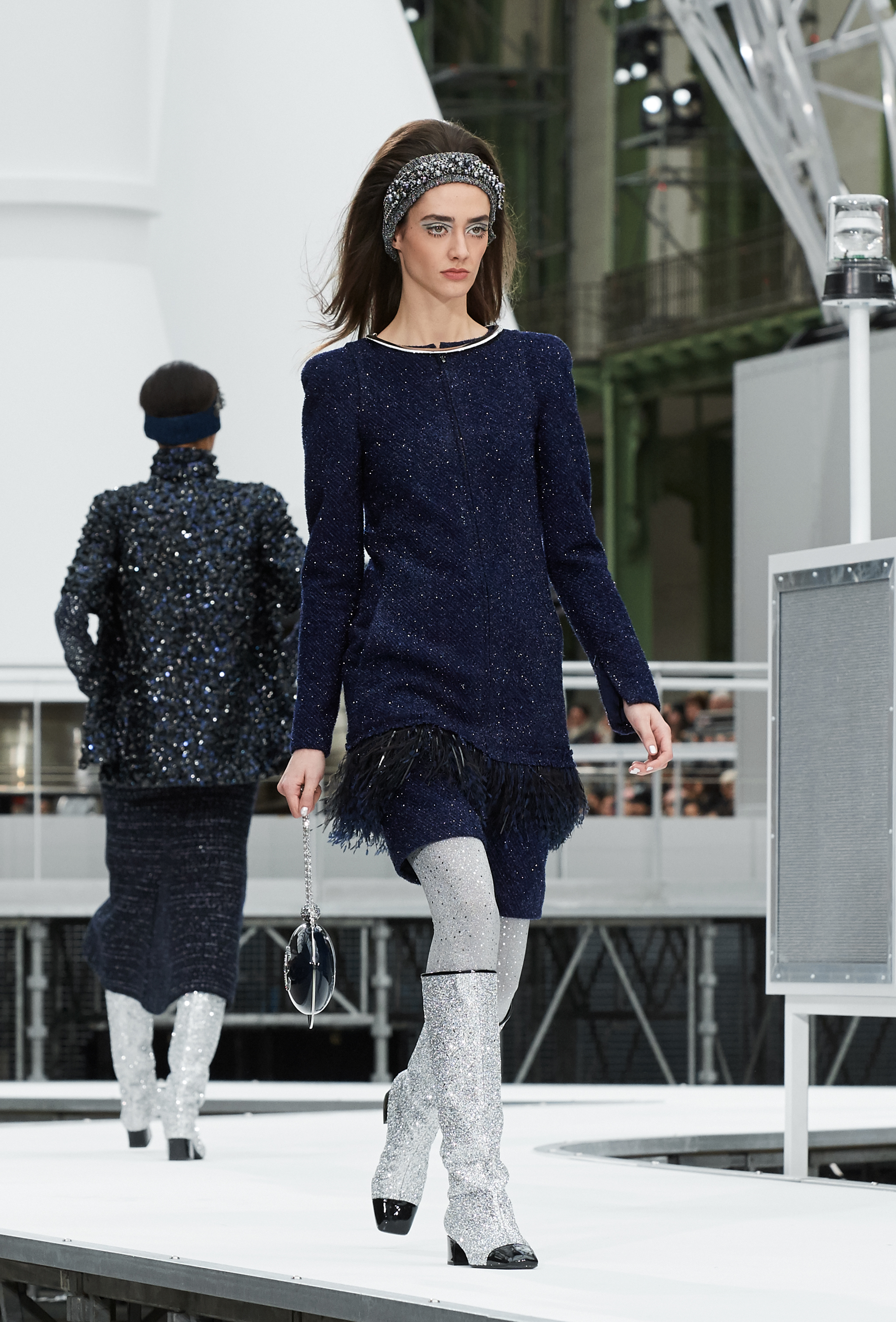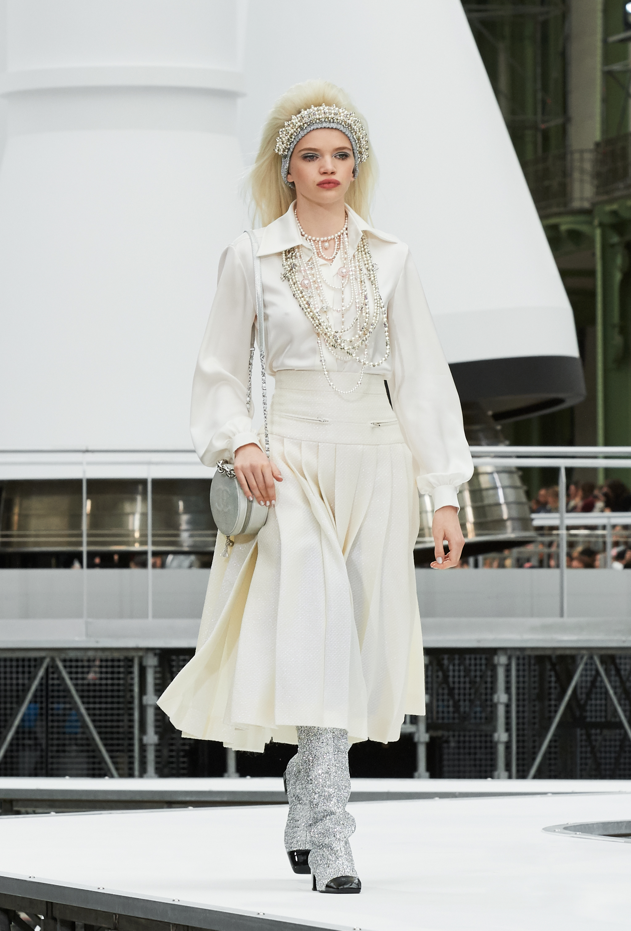 Um desfile que decolou para o espaço sideral teve uma pegada dos anos 60 e transformou o Grand Palais em uma base espacial com direito a um foguete em tamanho real, com 35 metros de altura, estilizado com logotipo da marca e instalado no centro da locação (e que se distanciando 10 metros do solo em direção ao teto de vidro do local).