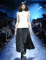 Também se viu uma variedade de plissados em azul, laranja, verde, amarelo, vinho e preto criados com técnicas especiais de cozimento e fervura em formatos rodopiantes.
