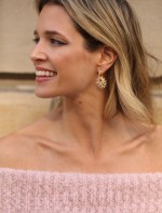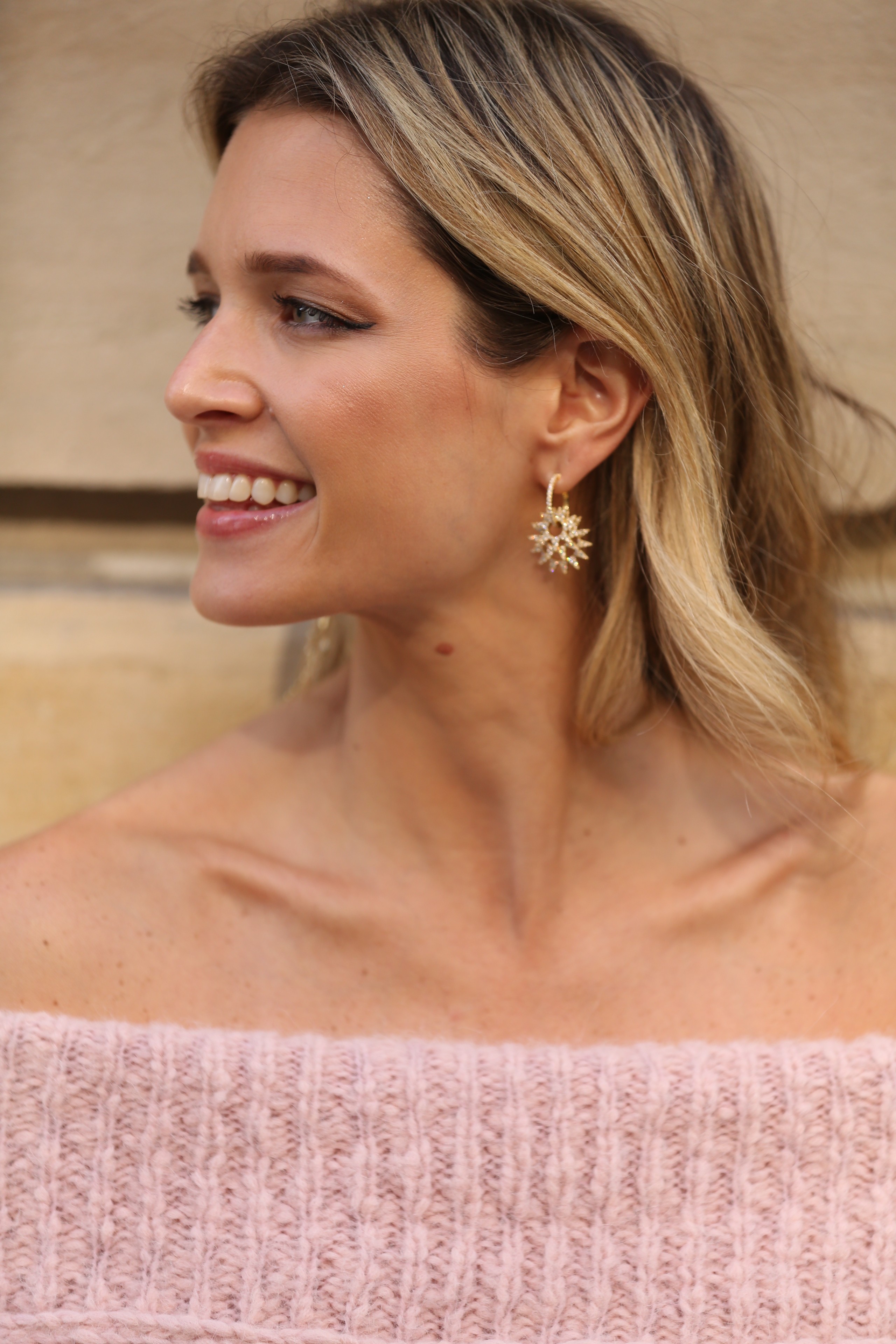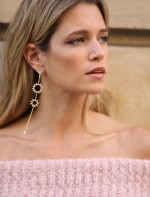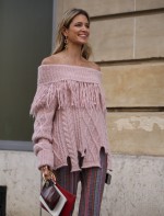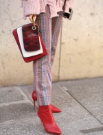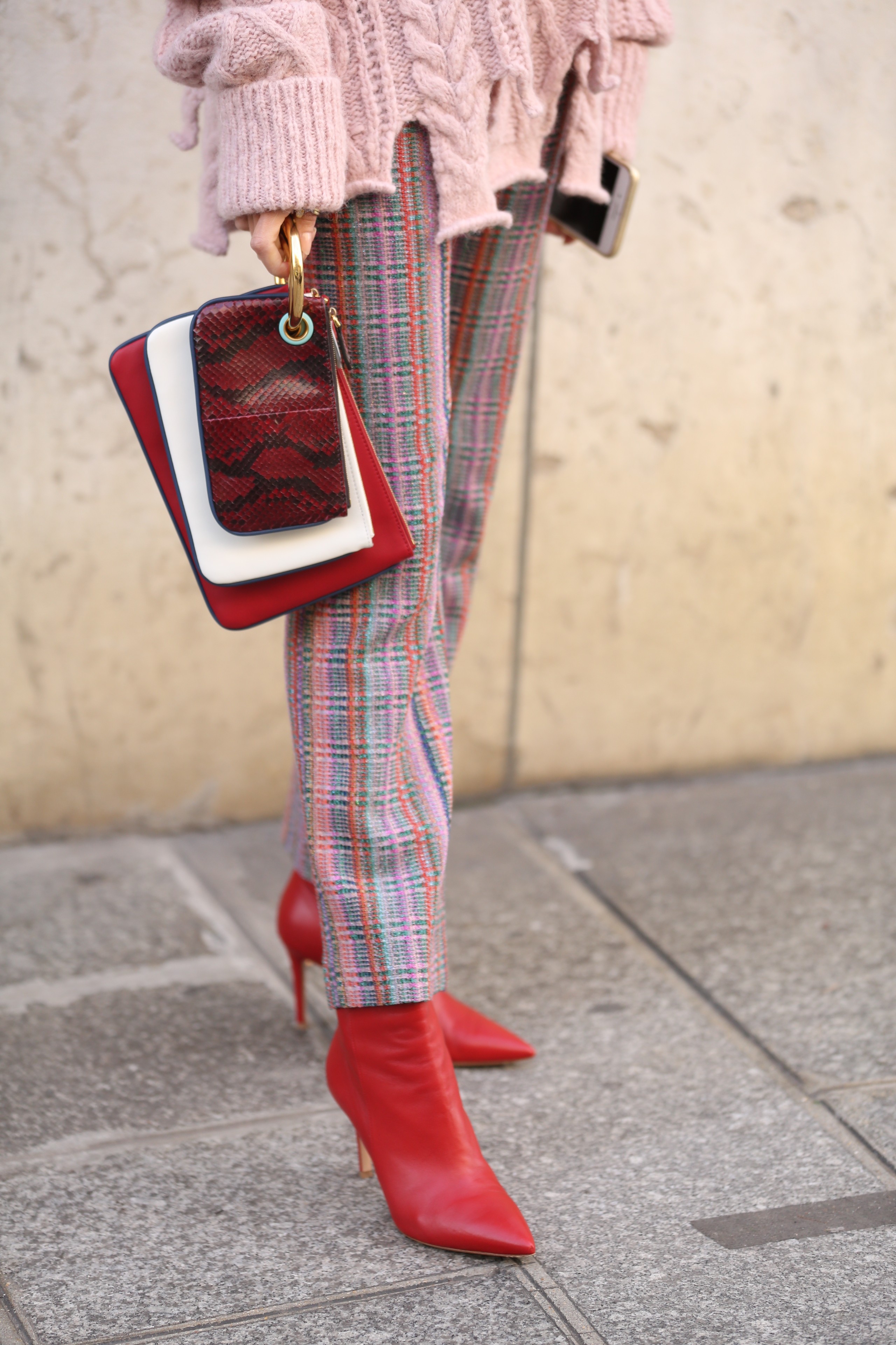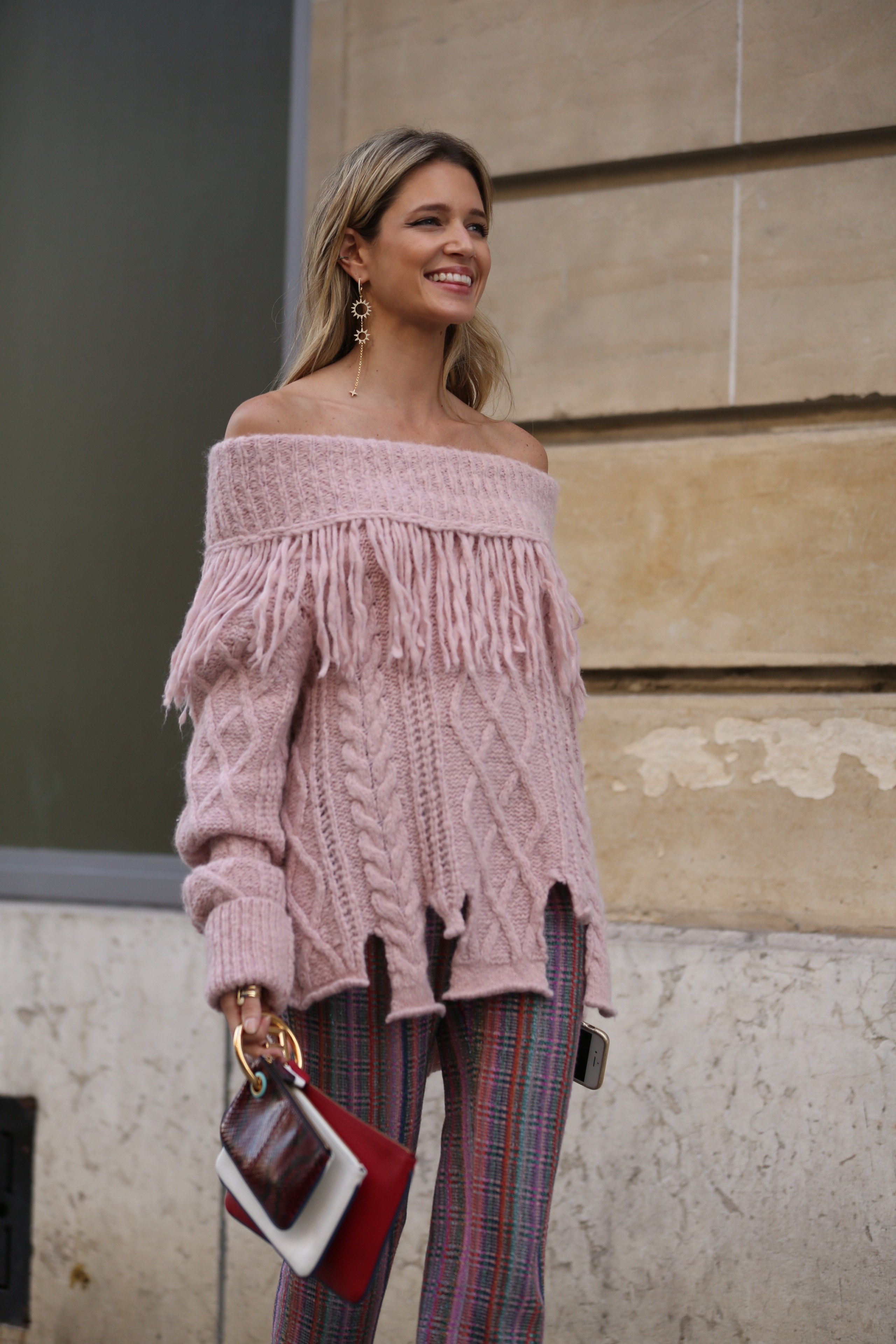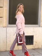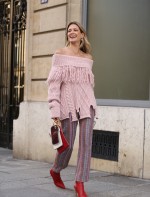 Para o desfile de Guy Laroche, a Helena escolheu um look sofisticado em tons de rosa com um toque de vermelho.