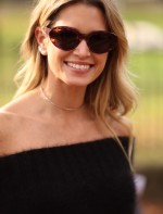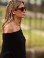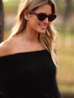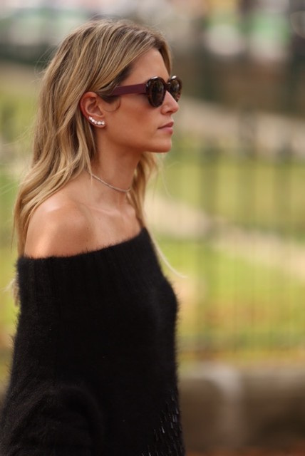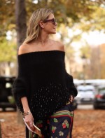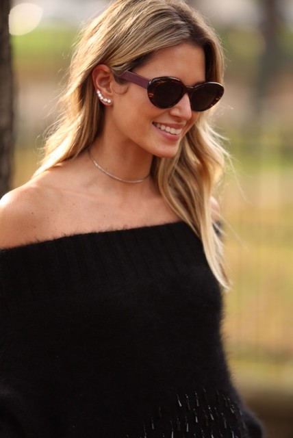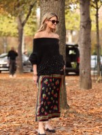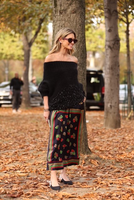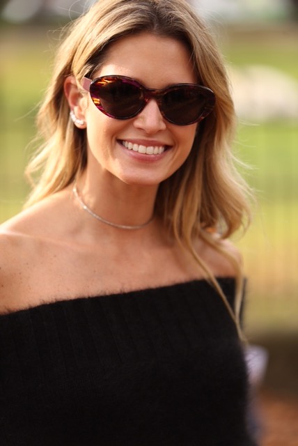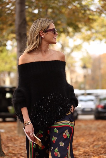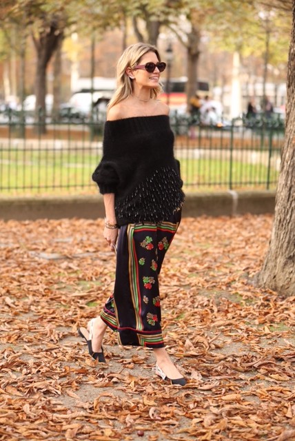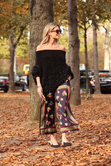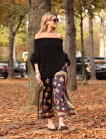 Para o desfile da Rochas, a Helena escolheu uma calça estampada e uma blusa com texturas.