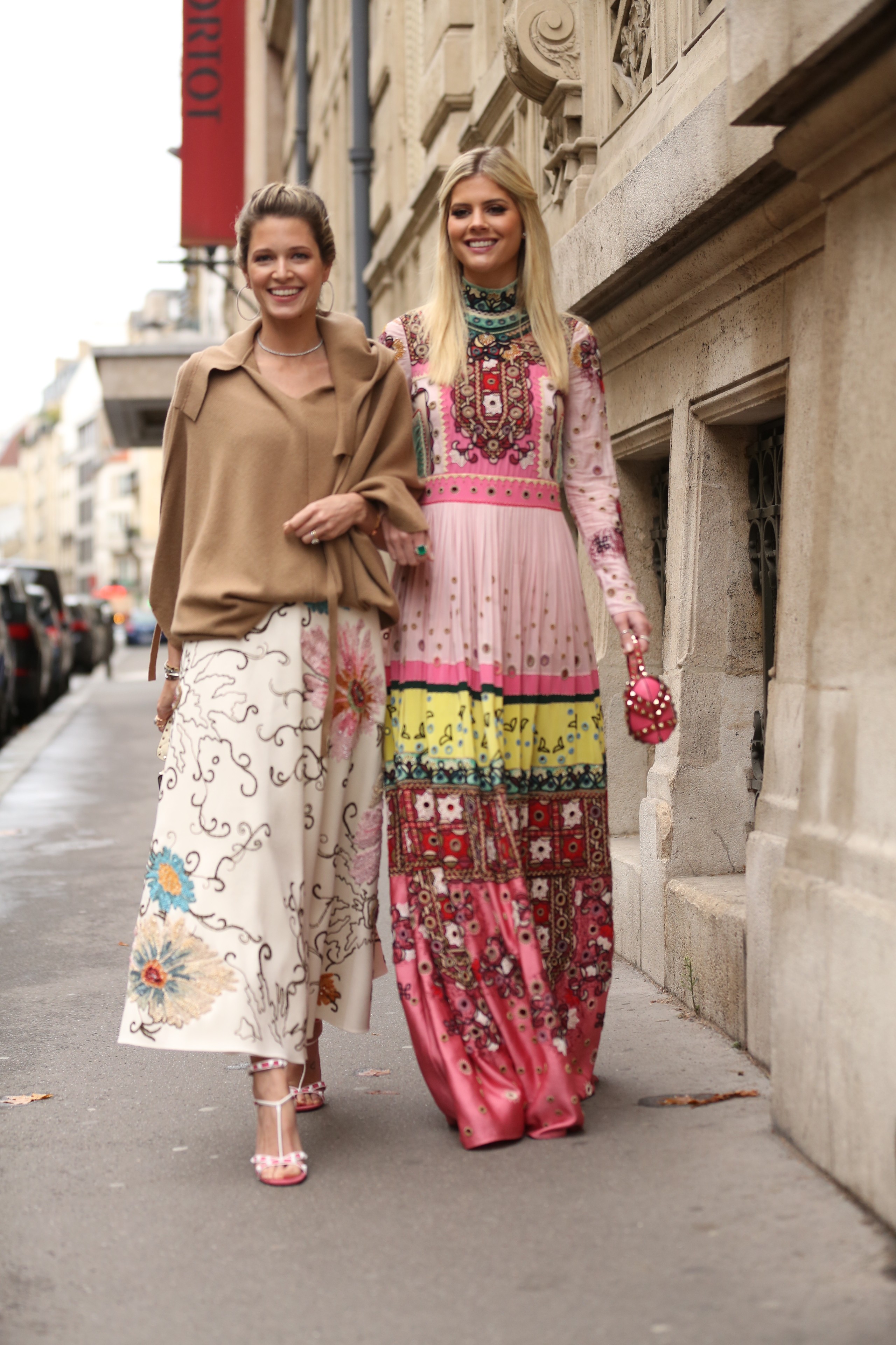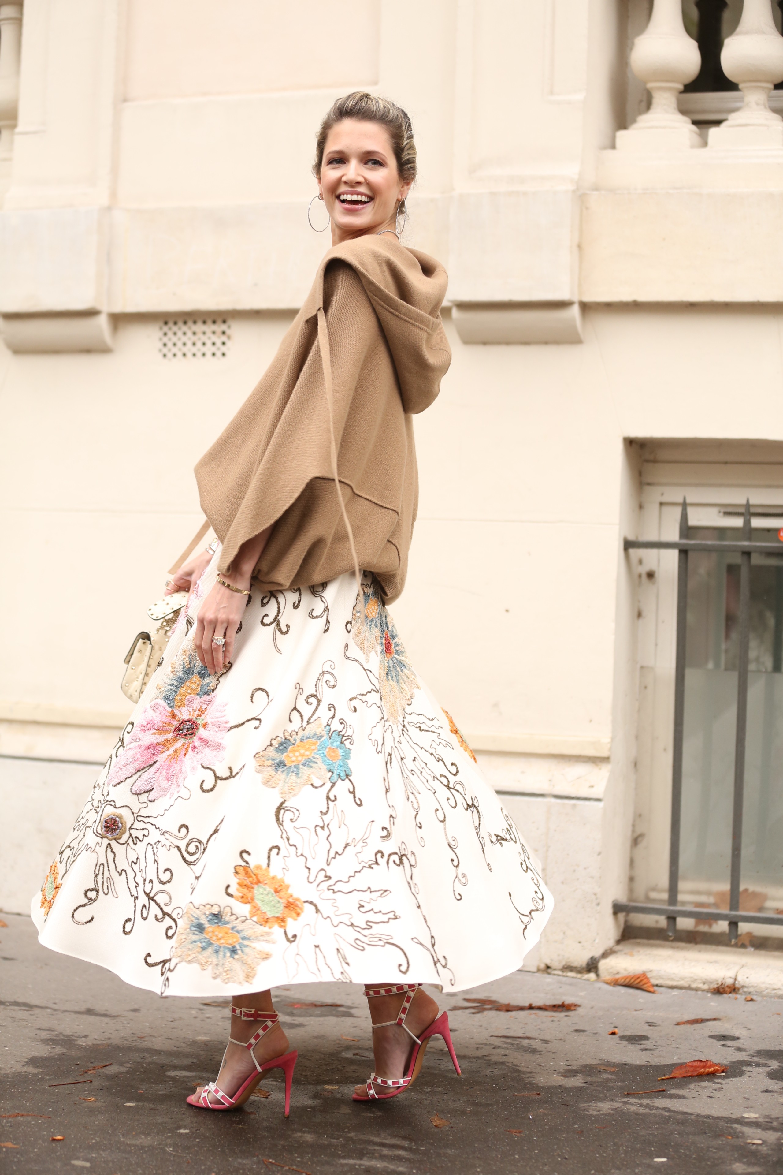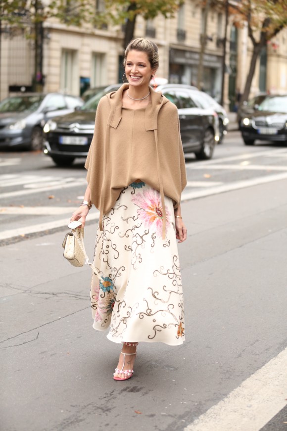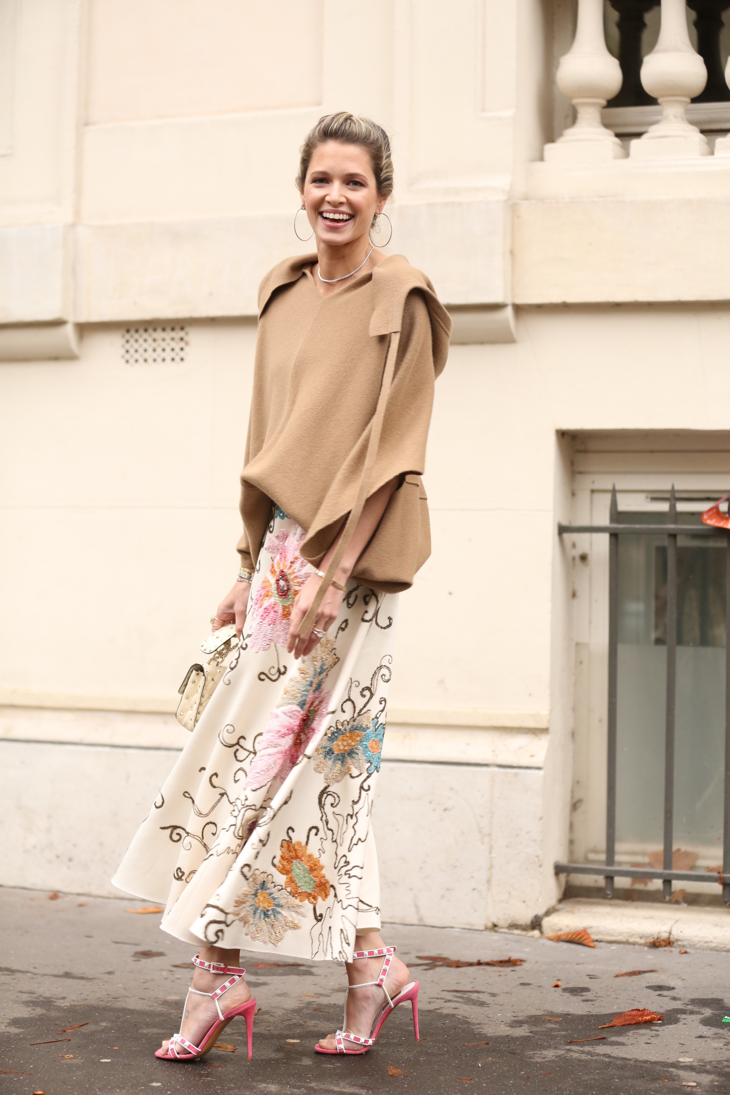 Para o fantástico desfile do Valentino, a Helena usou um look todo da label: blusa com recortes, saia estampada bordada, sandália bicolor e bolsa com tachas.
