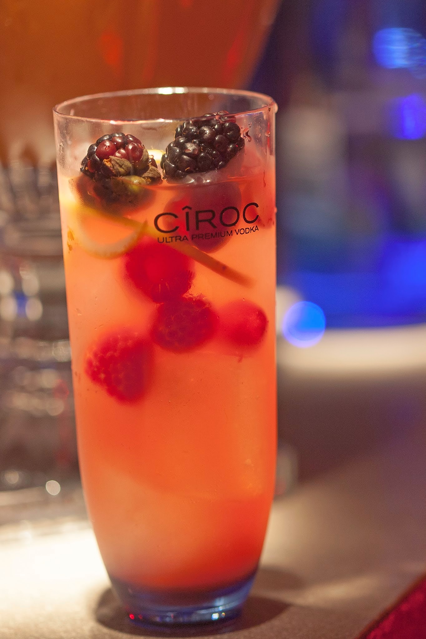 CÎROC Red Berry, Espumante, Suco de Pêra, Licor Poire Willians, Uvas Tintas, Amoras, Framboesas e fios de Cítricos.