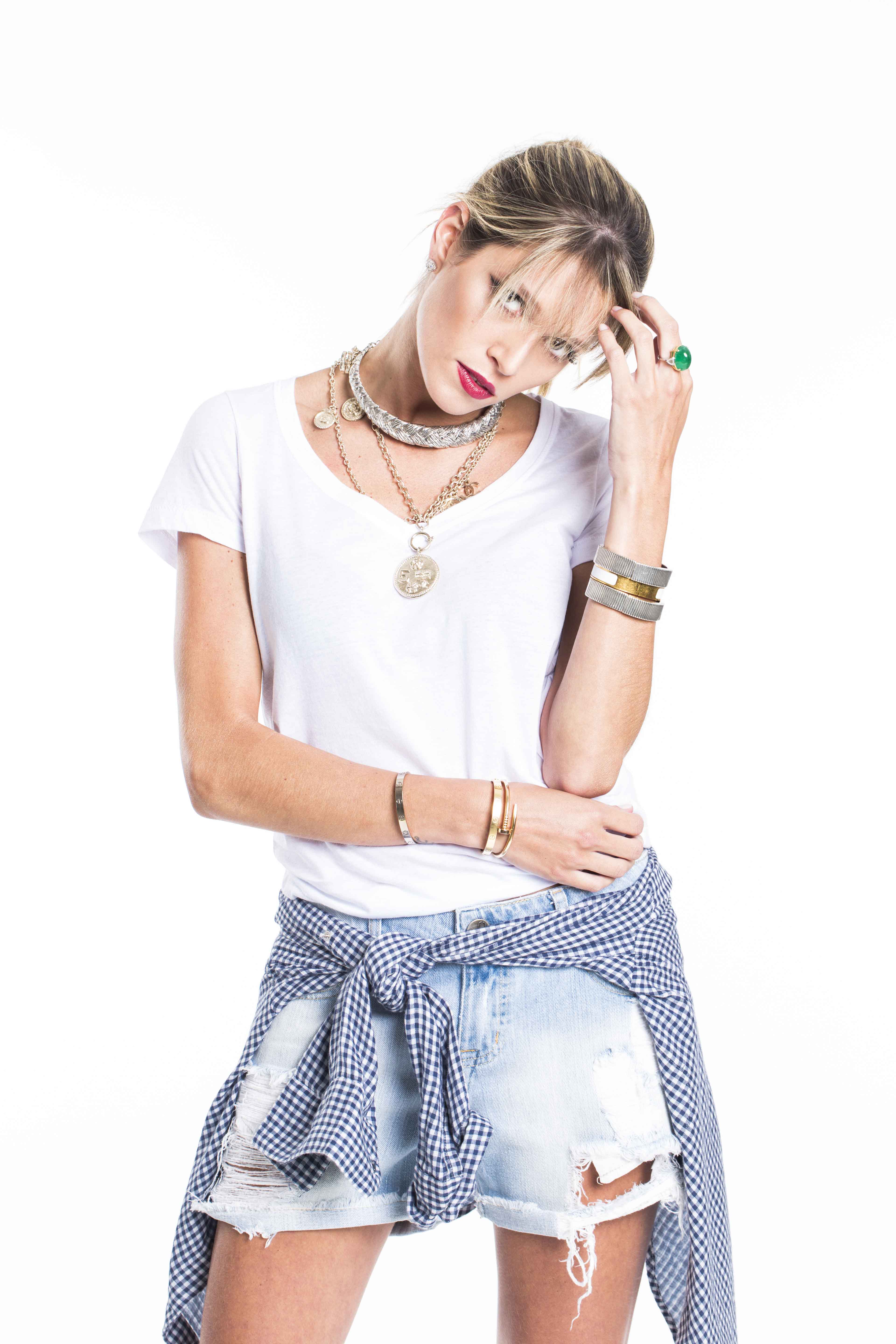 - – short jeans Daslu – camisa quadriculada Rag e Bone – bota Chanel – colar Chanel – pulseiras pratas camila klein – bracelete Hermés