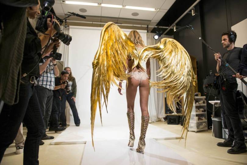 Dá só uma espiadinha em uma das modelos mais esperadas do desfile, a Candice Swanepoel, fazendo sua prova de roupa e que sem querer caiu na internet! Parece ser do primeiro tema “Golden Angels”, né?