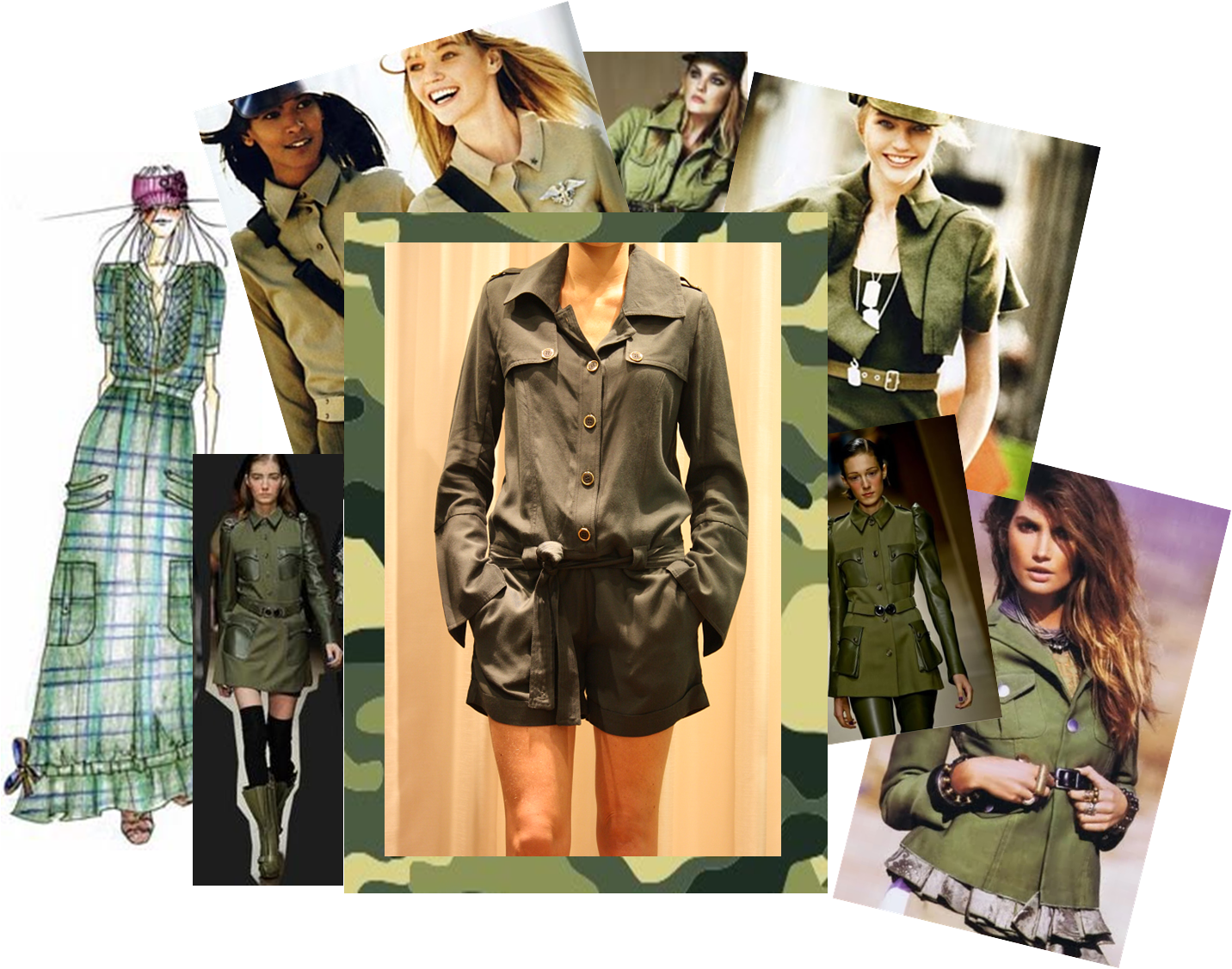 Os uniformes militares foram se adaptando aos poucos às curvas da mulherada. Na era dos anos 60, manifestantes usavam roupas camufladas e estilos temáticos para manifestar contra a guerra.