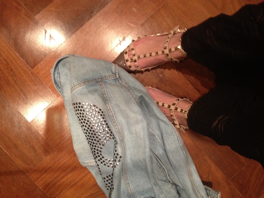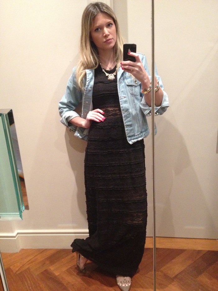 Para o fim de semana com feriado em SP, um dos meus looks preferidos é esse: vestidão Charlotte Ronson com jaqueta jeans da 284. E tem gente que não gosta, acha a mistura meio improvável, mas eu adoro porque quebra o romantismo do vestido, que é longo e todo rendado. O ponto alto dessa produção são as tachas, que estão no sapato Valentino e nas costas da jaqueta. Ahh e o colar também é 284 – e você pode encontrar o mesmo, ou outras peças no site do OQ Vestir!