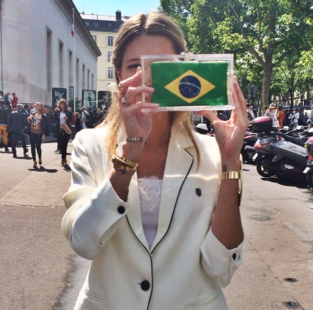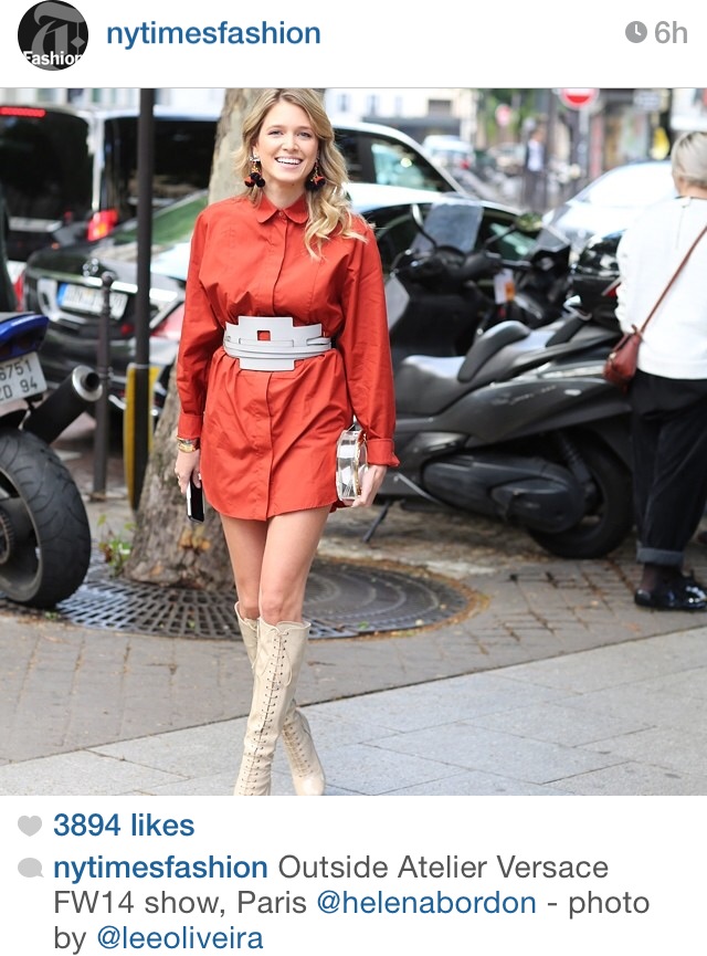 - O primeiro dia do PFW foi marcado pelo desfile da Versace! Na foto estou com camisa e cinto Tod’s, bota de cano alto Miu Miu, clutch Charlotte Olympia e brinco Mixed.