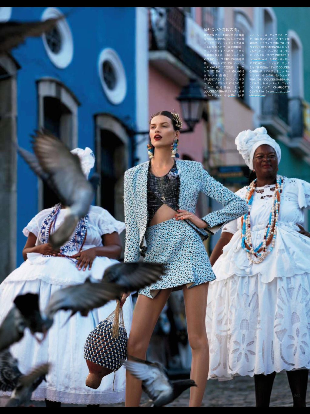 Anna Dello Russo, editora chefe e consultora criativa da Vogue Japão, fez um pitstop em Salvador, na Bahia, no mês de janeiro. O motivo? Fotografar os editoriais da Vogue Brasil de fevereiro, e é claro, produzir algum ensaio para a publicação coordenada por ela. O resultado foi publicado na edição de abril, e conta com fotos de Giampaolo Sgura – o mesmo fotógrafo responsável pelos editoriais publicados no título brasileiro – com a modelo Bette Franke e styling assinado por Anna. Como uma continuação da versão original, o ensaio mostra o que Salvador tem de melhor – alegria, cores, energia e muitos contrastes. As imagens estão abaixo…