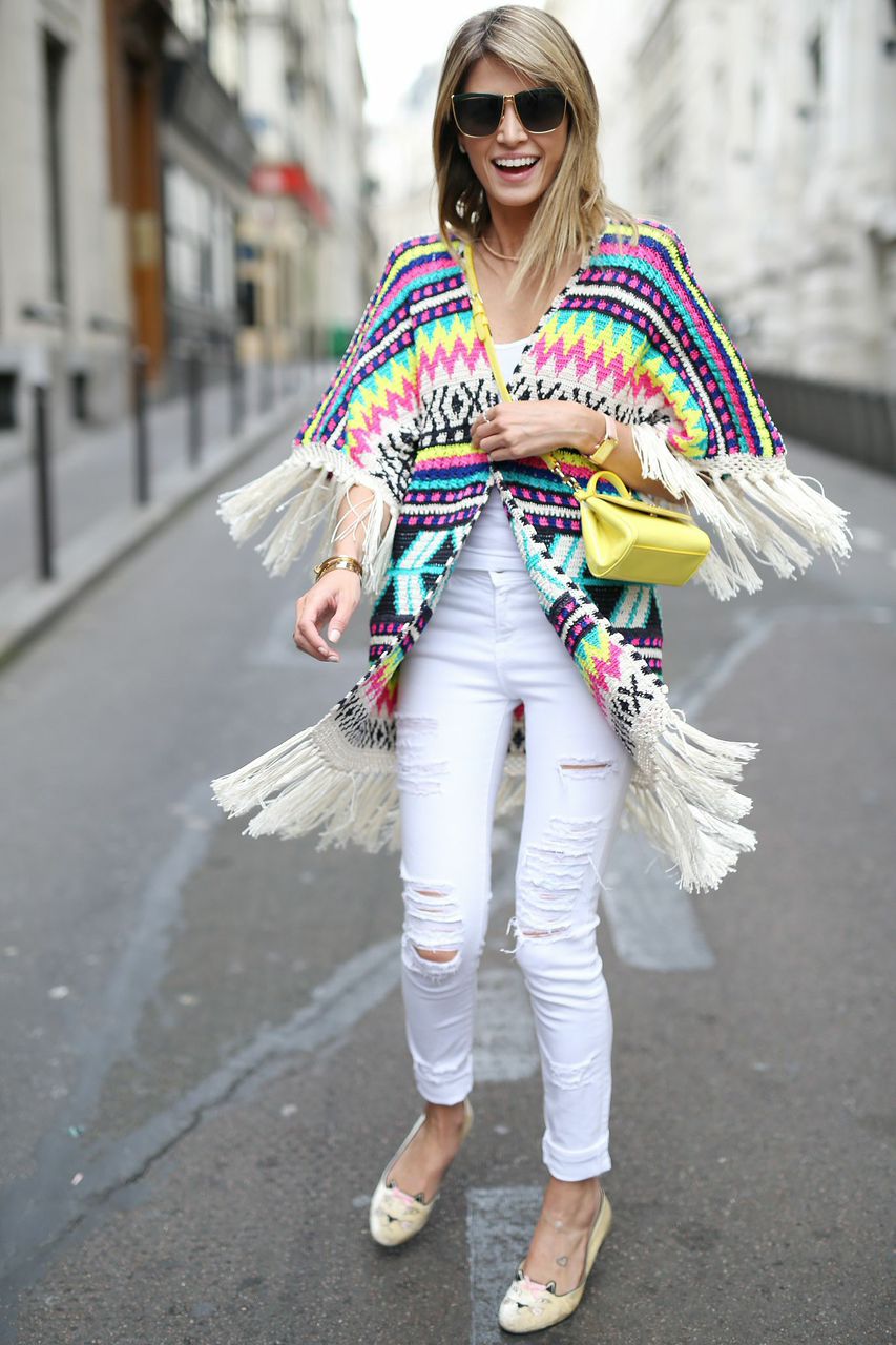 Usamos o jeans destroyed branco com um poncho colorido. Gostaram?
