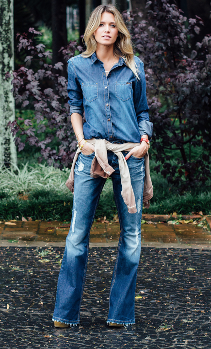 Denim flare: antigamente conhecida como Boca-de-Sino, hoje a calça flare, pode ser mais justa ou mais soltinha no corpo, mas sempre cria um visual chique e elegante. Ideal para ser usado com um salto, acrescentando mais qualidades para o seu look. Funciona com qualquer combinação, incluindo um blazer e t-shirt, dando um visual moderno e chique.