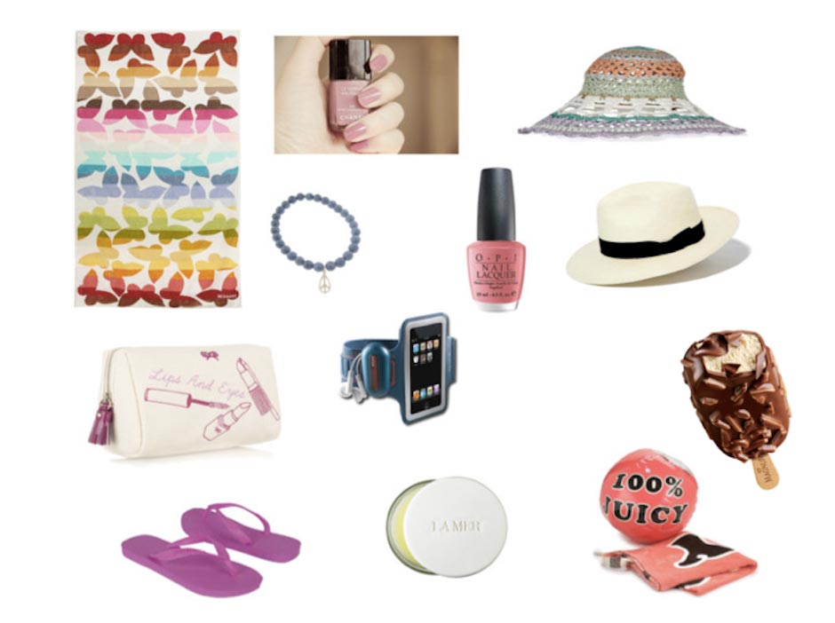 Finalmente as coisas que eu não vivo sem! Um bom creme para ficar hidratada, flats e havaianas, chapéu, uma boa lista de músicas para o iPod, muitas pulseirinhas e muiiiito sorvete pra matar a vontade de doce no verão/praia. Gostaram?